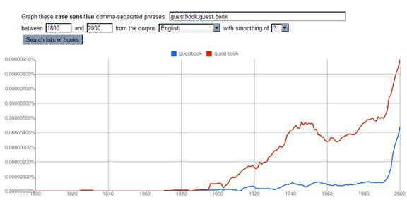 Aside from the suggestions of the Science authors noted above, we suspect that there are many rich pickings for dictionary makers in this vast trove of Google's data. One area that we think is especially promising is 2-grams, or to put it another way, two-word collocations. A vast number of compound nouns (and lesser numbers of compound adjectives and verbs) merit appearances in dictionaries because they are not understandable by combining the meanings of their parts — especially to language learners, who may lack the instincts about a language that native speakers possess. But it is easy for these terms to fly under the radar of headword gatherers because hitherto there have been no easy tools for collecting them. Take, for example, guestbook – or if you prefer, guest book.