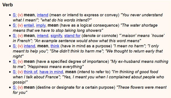An interesting case arose with the verb mean. The sense inventory (that is, the list of definitions) that the annotators worked with is the same one you see in the Visual Thesaurus: seven senses representing various shades of meaning of mean.