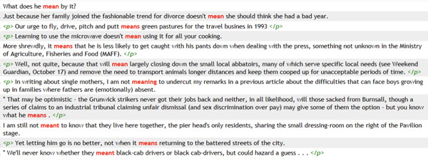 An interesting case arose with the verb mean. The sense inventory (that is, the list of definitions) that the annotators worked with is the same one you see in the Visual Thesaurus: seven senses representing various shades of meaning of mean.