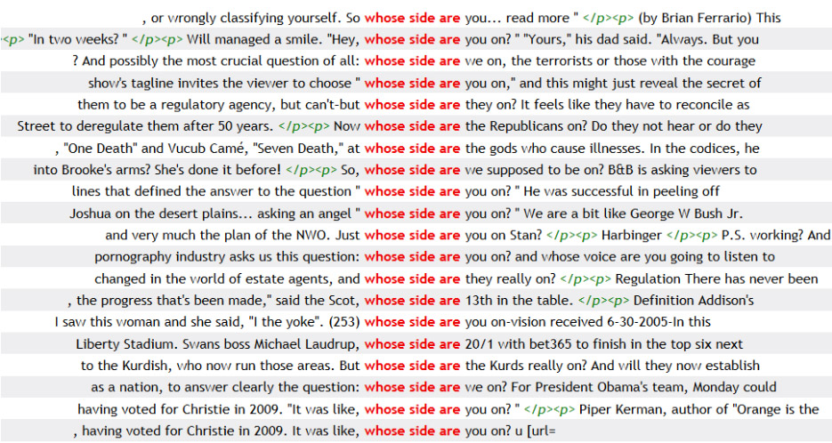 The frequent and somewhat formulaic question "Whose side are you on?" is typically asked in situations where someone's loyalty is in question: