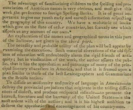 Webster's American Spelling Book (an excerpt is reproduced below) was already in print at this time and widely circulated, but he started out conservatively with the spelling reforms that are now chiefly associated with him, and his first dictionary, whose preface we quote at the top, preserved most traditional spellings. To the degree that the average American thought about it in 1812, English was the language that came to America from England, and anything authoritative about the language, whether in the form of books or pronouncements, probably came from the same place — the country of which many Americans had been subjects until recently. Webster, on the other hand, was clearly thinking along other lines: