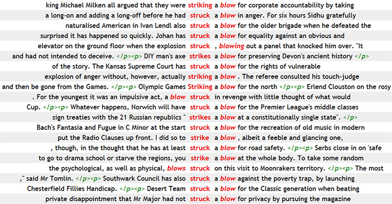 And there's blow (noun), a nice 15th-century word with solid bodily impact credentials. It has been popular to "strike a blow" since the mid-18th century, and in the beginning, most of these blows were physical. "Strike a blow" has seen declining usage since the beginning of the 20th century, but these days when we do it, the blows are as likely as not to be delivered with words, as these citations from the Guardian show: