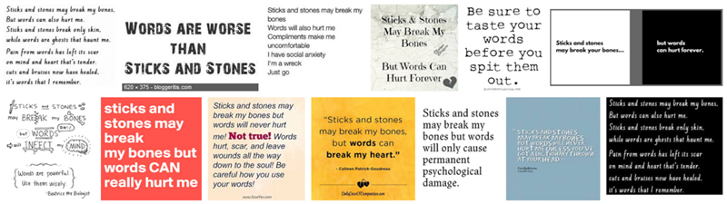 When I was a child, after a bruising (I'll get to that in a minute) verbal fight with one of my brothers, and after I had cried out "Mom, he called me a _________!", the usual reply would be "Sticks and stones can break my bones but words can never hurt me." This was surely one of my earliest experiences of cognitive dissonance. I hope parents and other adults no longer say this to children. As I look around online, I am encouraged: there are many variations on this old chestnut, most of which make a point of directly contradicting the meaning and intent of the original. That's as it should be, because we all know that words can hurt, in nearly sense of the verb: be the source of pain, give trouble or pain to, cause emotional anguish or make miserable, cause damage or affect negatively, and hurt the feelings of.