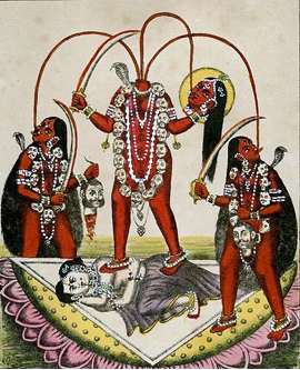 It seems likely that blood has the same startling iconic value in all cultures. By way of example, here's a depiction of the Hindu goddess Chinnamasta, whose spurting blood nourishes her own severed head, as well as her attendants.