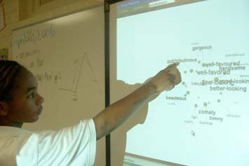 Gina: I use a Smart Board, an interactive white board that acts like a giant mouse. When you touch the board, you move a mouse on the computer it's connected to. The Visual Thesaurus works great with it. I project the VT onto the Smart Board. The kids "touch" the words when they touch the board, and move them around. It works really well when the Visual Thesaurus is in 3-D mode. The kids think it's cool.