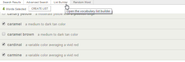 Instantly, we saw every word associated with color our Dictionary has to offer. We then used the List Builder tool to select the words we wanted to keep track of, coming up with 195 wonderfully specific ways to describe color.