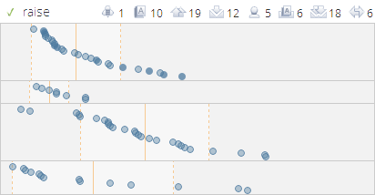 Currently, we use 77 different questions to teach raise, which we group by the various meanings of the word. On each meaning, we have multiple types of questions that span a range of difficulties. This graph shows our 77 questions on the word raise, organized by meaning and difficulty.