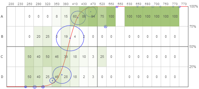 We create a statistical model for each of the more than 120,000 questions in our game. In this model, the red line shows how we expect the question to perform and the blue circles represent actual user data. To date, we have analyzed about 200,000 data points on the word raise alone.