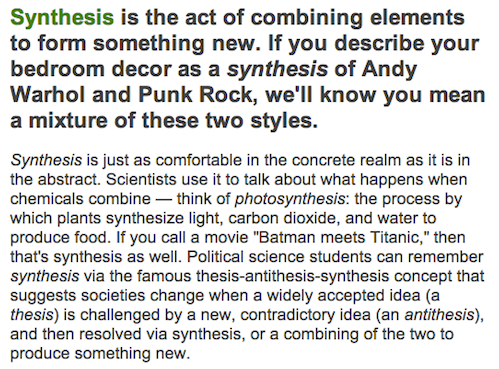 Coleman is right. Synthesis is a powerful word with many uses. It's also a tricky word — each use requires slightly different information about what the word means and what it can do. Here's how we explain it on its definition page in the Vocabulary.com Dictionary, always a good place to begin when breaking down a word.