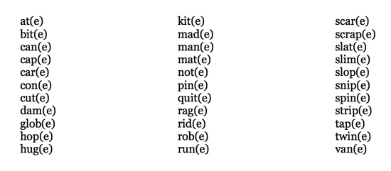 Note what they all have in common: They originally ended in a "short" vowel and a consonant, but the "silent e" changes the "short" vowel into a "long" one. (If you've forgotten the "long" vowel sounds just like the letter itself, as in "ohhh," "eye," and "you." The "short" vowel doesn't.)