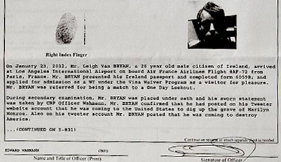 Bryan and Bunting were stopped, questioned, and stamped "return to sender" because the federal government diligently scans social media like Facebook and Twitter, as well as blogs and online news reports, in an effort to stop terrorist activity before it starts. To that end, the Department of Homeland Security maintains a terror-word watch list of about 500 items (see pages 20-23 of this link). Destroy isn't on the watch list of the MMC — the media monitoring capability group tasked with alerting their superiors to IOI's (Items of interest) that they find when reading social media. The list has nothing about Marilyn Monroe, either, though she is buried in a cemetery in the Los Angeles neighborhood of Westwood. But some Twitter-reading algorithm, or possibly a snitch, tipped off the feds to Bryan's plans, and agents were able to intercept the Irish national before he and his English companion — agents suspected she would act as the lookout for the Marilyn Monroe exhumation — could do any serious damage. Needless to say, Bryan didn't get to do any serious partying either.