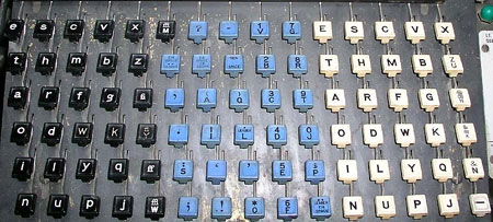 [Etaoin shrdlu, pronounced eh tay oh in SHIRD loo, is a phrase (of sorts) composed of the 12 most common letters in English, in descending order of frequency. The sequence of letters in the phrase originated from the way the most frequently used letters in the English language appear on the first two lines of keys on the left side of the keyboard of the linotype machine, which, from 1886 until the advent of computerized typesetting, was used to set type for newspapers and other publications. Linotype operators could not start a line over if they made a mistake; they had to finish it, which they did by simply running their fingers down the two lines of keys on the left side of the keyboard, keys that happened to spell out etaoin shrdlu. Then they would begin the line again. If a linotyper forgot to discard the bad line — by physically lifting it from the banks of type — it would appear in the newspaper. For a century etaoin shrdlu must have appeared in newspapers millions of times.]