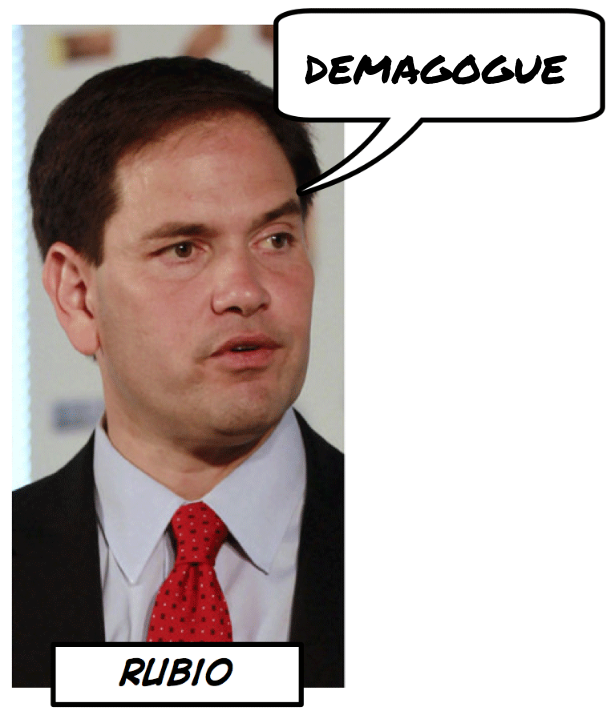 Senator Marco Rubio, considered by many analysts to have advanced his standing through his performance in the debate, wins points in our book for his use of demagogue.