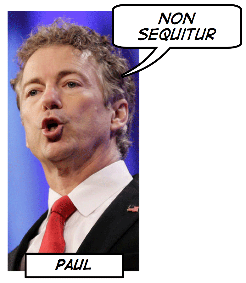 Rand Paul defensively used non sequitur to refer to an attack by Trump, who suggested that Paul should not even be on the stage because of his low polling numbers. The Latin expression now firmly entrenched in English suggests a lack of logical sequence from one idea to another. Kasich also went Latin by using the phrase ad hominem. But CNN moderator Hugh Hewitt wins the Latin prize for using the legalistic phrase sua sponte, meaning “of one’s own accord.”