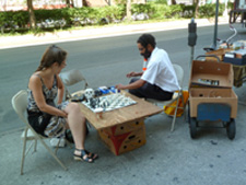 "Ahmad doesn't charge anyone to sit down and play," Lenore Apsel, a long-time friend and regular at his chessboard, told me. "He also teaches a few children in the neighborhood and refuses to accept any money from the parents." His business, she said, is selling books, the chess games are strictly an avocation.