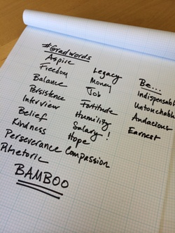 The list was gathered through comments on #gradwords posts on our blog, our Twitter account, and Facebook page, where we saw that freedom, money, job, interview, salary, belief, balance, hope, persistence, fortitude, perseverance, compassion, kindness, humility, equanimity, discursive, and perspective were top of mind. Congrats especially to vocabularian Sarah L., who interpreted the assignment creatively, writing: "Bamboo: be flexible, but still strong and rooted, when life throws you unexpected twists and turns."
