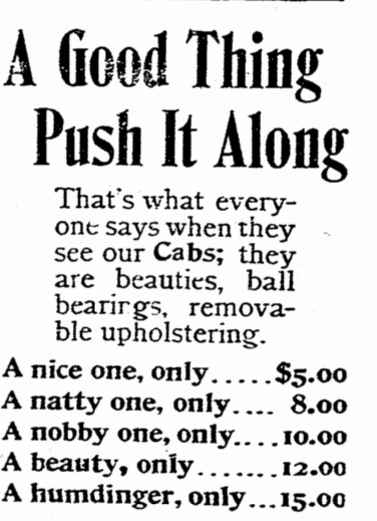 The 1883 example was discovered by Stephen Goranson and shared on the American Dialect Society mailing list. A cluster of slightly later examples from the mid-1890s turn up in the newspapers of Rockford, Illinois, including in a department store's advertisements for "baby cabs" (a regional term for baby carriages).
