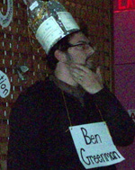The four survivors — Greenman, Kuczynski, Prose, and Singer — battled it out for three more rounds, before the appearance of the dreaded colophon — a word well-suited to the crowd, meaning "a publisher's emblem printed in a book (usually on the title page)." Like sacrilegious, colophon was a word that had brought down spellers in the past, and once again it spared no prisoners. Kuczynski, Prose, and Singer all misspelled it, with only Greenman left standing. And so Greenman donned the funny tinfoil crown, bringing an end to an entertaining evening for a good cause.