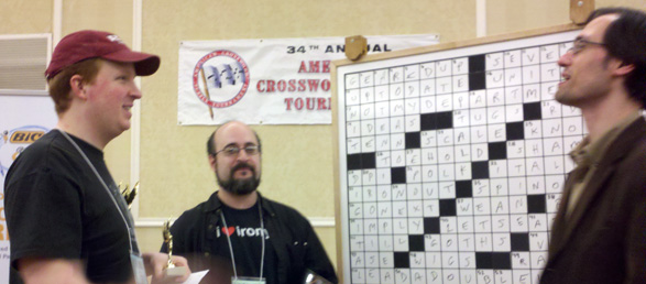 The Sunday-sized puzzle earlier that morning was by ACPT newcomers Ashish Vengsarkar and Narayan Venkatasubramanyan: "Kangaroo Phrases." There wasn't much help in this one as the long entries were all clued "[See highlighted letters]". And sure enough, each entry read like a crossword clue (TWITTER USERS UPDATE and "PURPLE RAIN" COMPOSER) where the circled letters spelled a common crossword answer clued by that entry (TWEET and PRINCE, respectively). Thanks to his mind-melting speed, Hinman finished fast enough to knock Brooklyn's Francis Heaney out of the race. Visual Thesaurus regulars will be pleased to know that our own superstar made a cameo at 1-Across in the puzzle: "Language maven Zimmer," three letters!