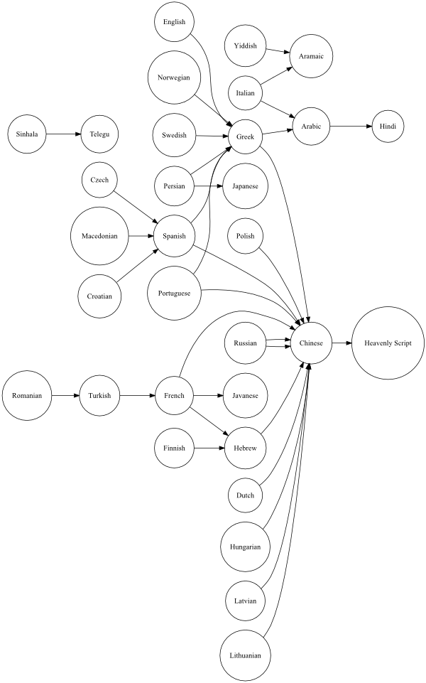 The computer scientist Arnold Rosenberg first looked at this cross-linguistic question in his 1979 paper, "The Hardest Natural Languages." University of Pennsylvania linguist Mark Liberman expanded on Rosenberg's work in a 2009 Language Log post, presenting a fascinating "directed graph of stereotypical incomprehensibility."