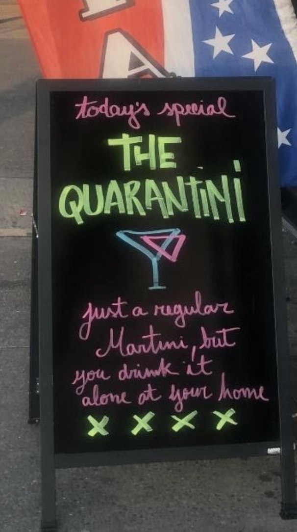 Quarantini. Any of a number of recipes for martini-like cocktails to be enjoyed during self-isolation. Related: Coronarita, a margarita-like drink made with Corona, a brand of Mexican beer.