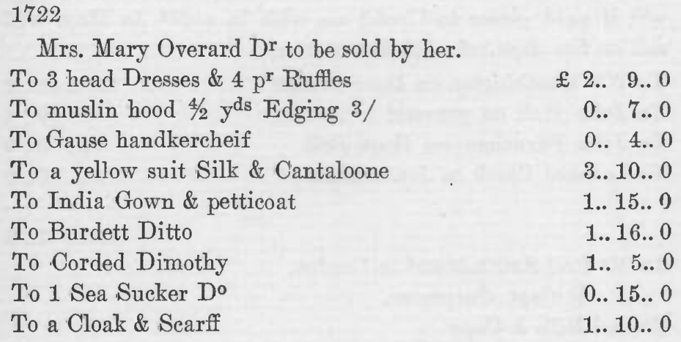 It would not take long for Indian seersuckers to make their way across the Atlantic. In fact, the 1722 example cited by the OED is from an American source. It shows up (spelled as "sea sucker") in a ledger item in the papers of the wealthy planter Charles Carroll of Annapolis (collected in a 1925 issue of Maryland Historical Magazine). Carroll listed items sold to Mrs. Mary Overard, including "corded dimothy" (dimothy was an alternate spelling of the fabric name dimity) and "1 sea sucker D°" (D° was shorthand for ditto).