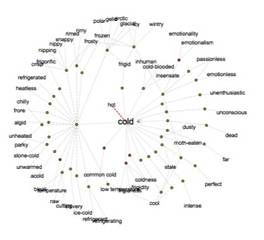 This type of thinking allows a writer to use gradable adjectives with more precision and to optimize the benefits of a thesaurus. On the other hand, students often sabotage their writing by randomly selecting any assumed synonym from a thesaurus. The word they select may not convey what they want, or it may serve the wrong grammatical function. Consider the Visual Thesaurus word map for cold, shown here. Only a handful of descriptors express the intensity of gelid: glacial, arctic, frigid, frozen, icy.