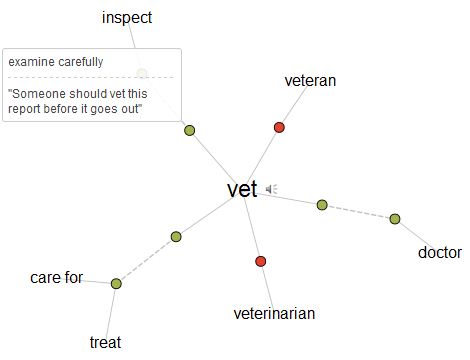 If you teach your students that their vocabulary goal is to memorize a bunch of words and corresponding definitions to pass a quiz next Tuesday, what message are you sending? You are unwittingly implying that understanding words in context and using words in a meaningful way is beside the point. This year, begin showing students that a dictionary definition is a place to start, but that exploring word relationships and usage is the place to end. Reward students for finding the right definition of a word in context. For example, if students run across the use of vet as a verb meaning "to examine carefully," have them identify the correct meaning branch of a Visual Thesaurus word map that fits that particular context.