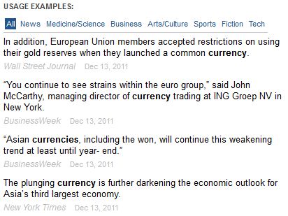 Take the word money as an example. A developing writer searching for a less common synonym for money might consult a thesaurus and end up choosing the word currency – not realizing that although they might share a similar denotation or definition, the words communicate different connotations and are used in different ways. The usage examples for currency on its Vocabulary.com dictionary page reveal that the word currency tends to live in specifically business-related contexts like Business Week and The Wall Street Journal. It shows up in phrases like "currency trading," "common currency," and is used in discussions of the won and the euro. Leading students to survey such usage examples can give developing writers more than a definition; it can reveal the word's "natural setting" — where experienced writers tend to use the word. These model sentences can then, in turn, guide students to make similar choices in their own writing.