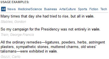 Q: What are some of the highlights of your life? Well, I made it big in biblical times by working my way into the Ten Commandments: "Thou shalt not take the name of the Lord thy God in vain." It was hard to top that, but I have impressive staying power. Famous poets like Emily Dickinson discovered me ("If I can stop one heart from breaking, I shall not live in vain."), and even pop song writers ("You're so vain you probably think this song is about you..."). (sources: Brainyquote.com, thinkexist.com, and songlyrics.com) Q: Is there anything else we should know about you? I don't know. You should try me out. I'm only one syllable, I rhyme well with others (e.g., gain, pain, train, explain, disdain, etc.), and you can make good use of me when insulting others. (source: Vocabulary.com dictionary's advanced search rhyming function) |