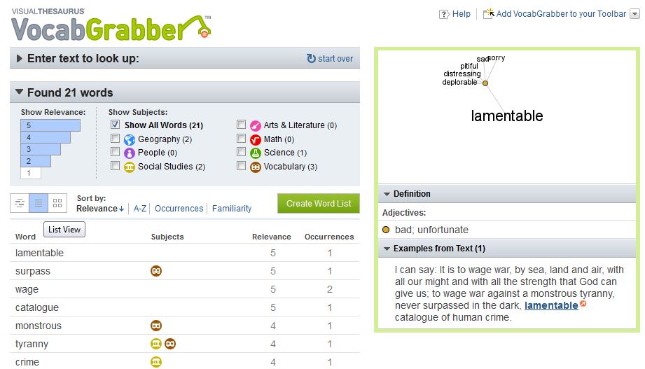 VocabGrabber orders a text's vocabulary by relevance — namely, how frequently words show up in a particular text as opposed to how frequently they show up in the English language in general. VocabGrabber is a useful tool to complement the Flesch-Kincaid scale, since it will give readers an overview of a text's vocabulary and will prioritize words that are highly relevant to comprehension.