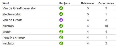 As you can see, the highly relevant technical jargon from this reading passage has come up on top in our vocabulary list. You would surely want to explore terms like "Van de Graff generator" and "electron orbit" before launching into a reading of this article. Start by reading aloud the definitions of such terms and how they are used in the context of the article by clicking on each of them and studying the VocabGrabber screens. Then, expand your exploration of such terms by clicking on the word maps and activating the Visual Thesaurus application. Try right-clicking on the terms (control-clicking on the Mac) and you can display enlightening images to reinforce the definitions for your students.
