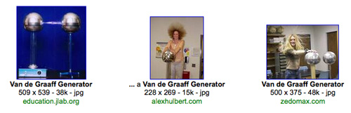 As you can see, the highly relevant technical jargon from this reading passage has come up on top in our vocabulary list. You would surely want to explore terms like "Van de Graff generator" and "electron orbit" before launching into a reading of this article. Start by reading aloud the definitions of such terms and how they are used in the context of the article by clicking on each of them and studying the VocabGrabber screens. Then, expand your exploration of such terms by clicking on the word maps and activating the Visual Thesaurus application. Try right-clicking on the terms (control-clicking on the Mac) and you can display enlightening images to reinforce the definitions for your students.