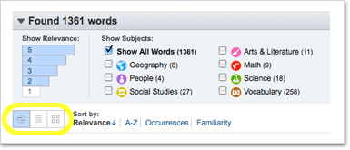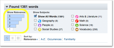 By default, the vocab list displays words with relevance 2 through 5, leaving off the words that score only 1 and are therefore least significant. But you can choose any combination of scores by clicking on the bars under "Show Relevance."