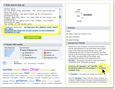 VocabGrabber analyzes any text you're interested in, generating lists of the most useful vocabulary words and showing you how those words are used in context. Just copy text from a document and paste it into the box, and then click on the "Grab Vocabulary!" button. VocabGrabber will automatically create a list of vocabulary from your text, which you can then sort, filter, and save.