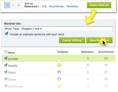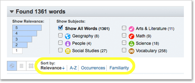Above the word list you'll see four different sorting options: Relevance, A-Z, Occurrences, and Familiarity. By default the words are arranged from most relevant to least relevant. The other options allow you to sort your list alphabetically, by number of occurrences in the text, or by how familiar the words are in written English overall. To reverse any of these orderings, just click on the name of the option again to toggle the list order.
