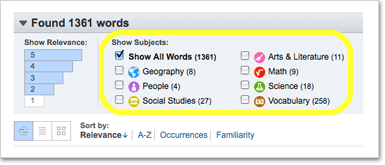 Your list will initially have the "Show All Words" box checked. But if you want to focus on vocabulary in one or more particular subjects, just click the appropriate box or boxes. The number in parentheses next to the subject name indicates how many words in the text match the subject.