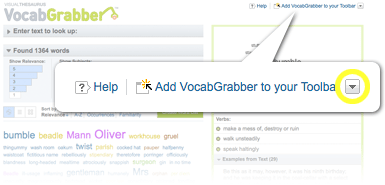 In the top right-hand corner, click on the button next to "Add VocabGrabber to your Toolbar." Then follow the directions for your browser to install the VocabGrabber directly on your toolbar. Once installed, you'll be able to use the VocabGrabber on any online text without having to copy and paste. Just click on the VocabGrabber "bookmarklet" and the VocabGrabber will immediately start grabbing the vocabulary from whatever page you're reading in your browser.